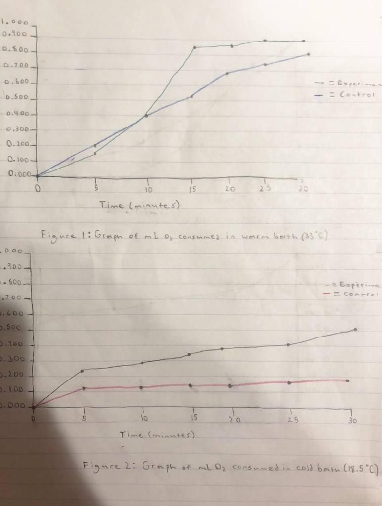 After the setup for the respirometers was complete, the respirometers (both the controls and the experimentals) were placed in baths of water at two different temperatures. After letting the respirometers acclimate to the air pressure while in the bath, the respirometers were fully submerged and a timer was set after the water reached the first graduation. Every five minutes, data was recorded (see table 1).