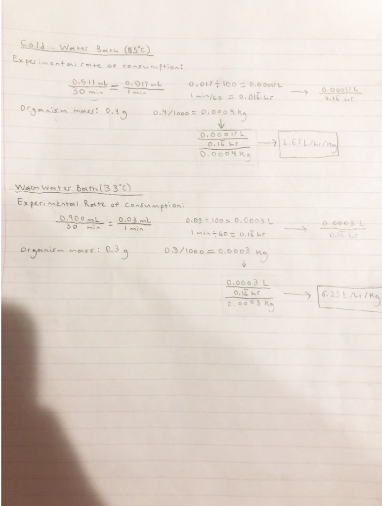 Based on the gathered data, the rate of oxygen consumption was measured for each chamber. The rate was calculated by dividing the total volume of oxygen by time (see figure 1 and calculation section). This calculation was then converted from mL per minute to L per hour (see calculation section). The recorded mass of the organism was converted from grams to kilograms in order to determine the metabolic rate in L per hour per kilogram (see calculation section).